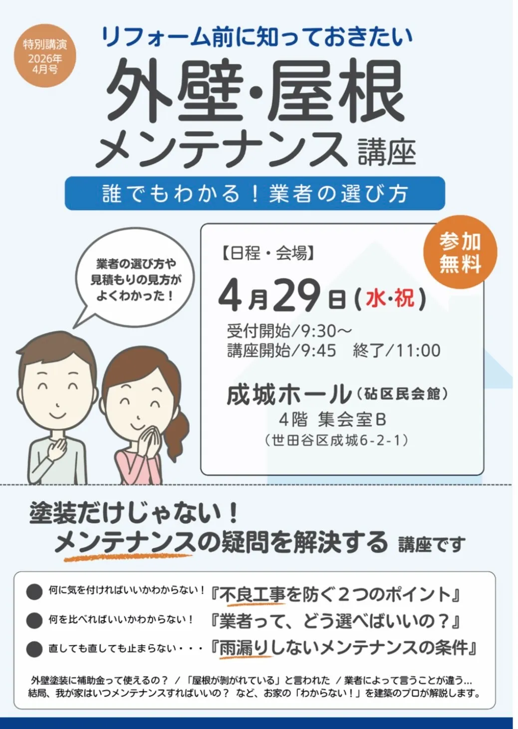 4/29 屋根と外壁メンテナンス講座『成城ホール』 2026/04/28 株式会社ぬりかべです! 明日になりますが4/29に世田谷の成城ホールでセミナーを開催します! 無料での開催になりますので気軽にご参加ください! ご予約お待ちしてます!